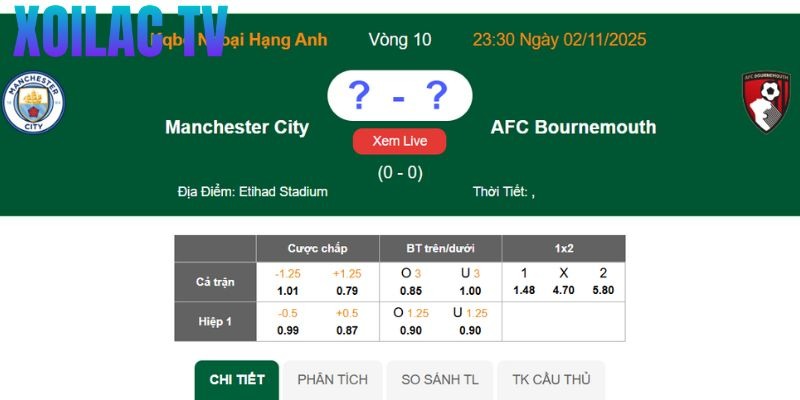 Manchester City chắc chắn sẽ là đội cửa trên với mức kèo chấp rất cao, có thể lên tới -1.25. Với sức mạnh tấn công hủy diệt và lợi thế sân nhà, việc The Citizens thắng với cách biệt từ 3 bàn trở lên là điều hoàn toàn có thể xảy ra. Trong quá khứ, Man City cũng đã nhiều lần vượt qua những mức kèo chấp tương tự khi đối đầu với Bournemouth. Lựa chọn Man City ở kèo châu Á dù chấp sâu vẫn được xem là một quyết định an toàn hơn.